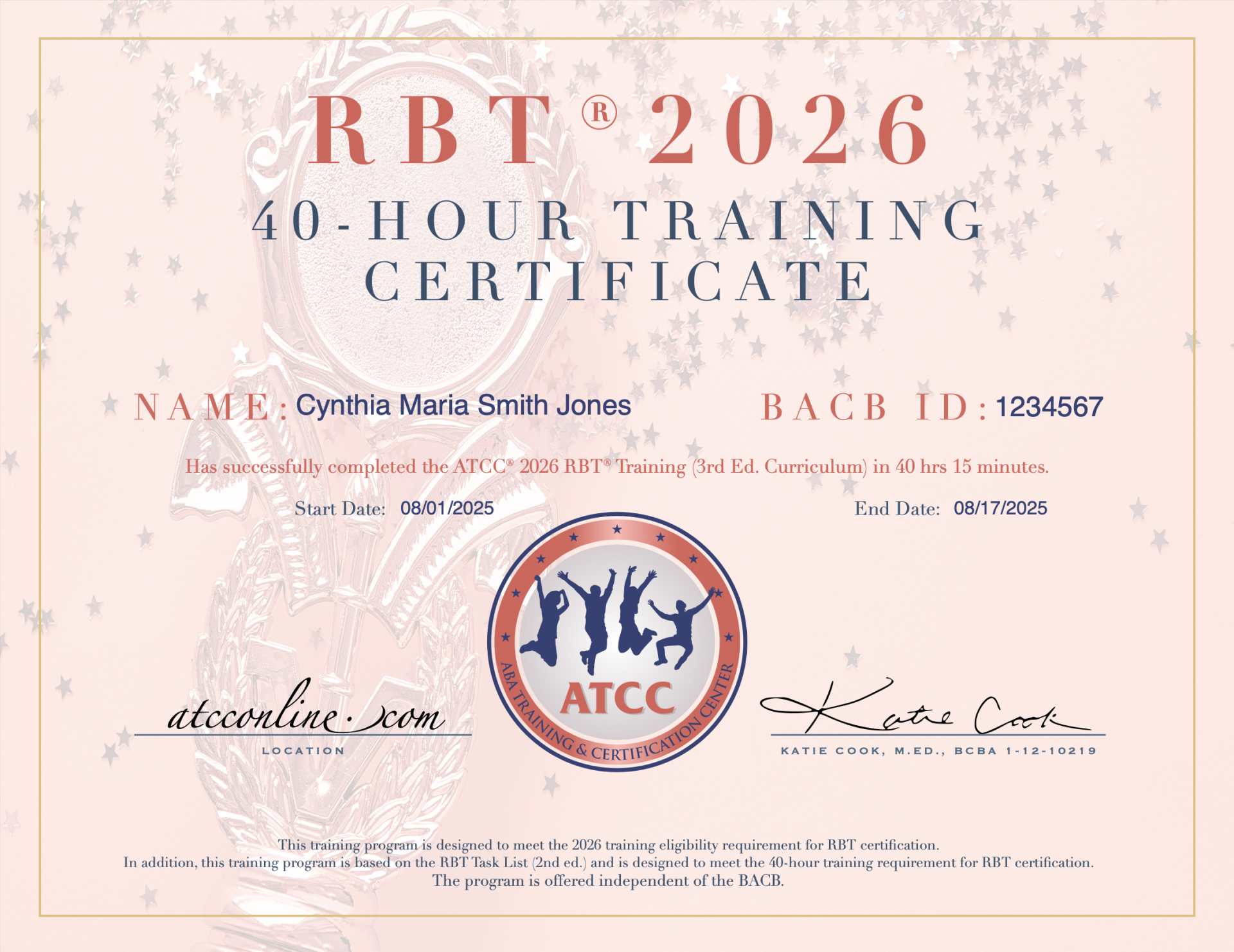 Looking for the best RBT® training and certification programs? ATCC® offers comprehensive, expert-led training aligned with the 2026 RBT® 40-Hour Training Requirements and the RBT® Test Content Outline (3rd ed.). Our programs prepare aspiring Registered Behavior Technicians® for BACB® certification with high-quality instruction, RBT® Competency Assessments, and remote BCBA® supervision. We also provide ABA parent training to support families of children with autism. Whether you're starting your career or advancing your skills, ATCC® delivers the trusted training you need to succeed in the field of Applied Behavior Analysis. Contact us today to get started!