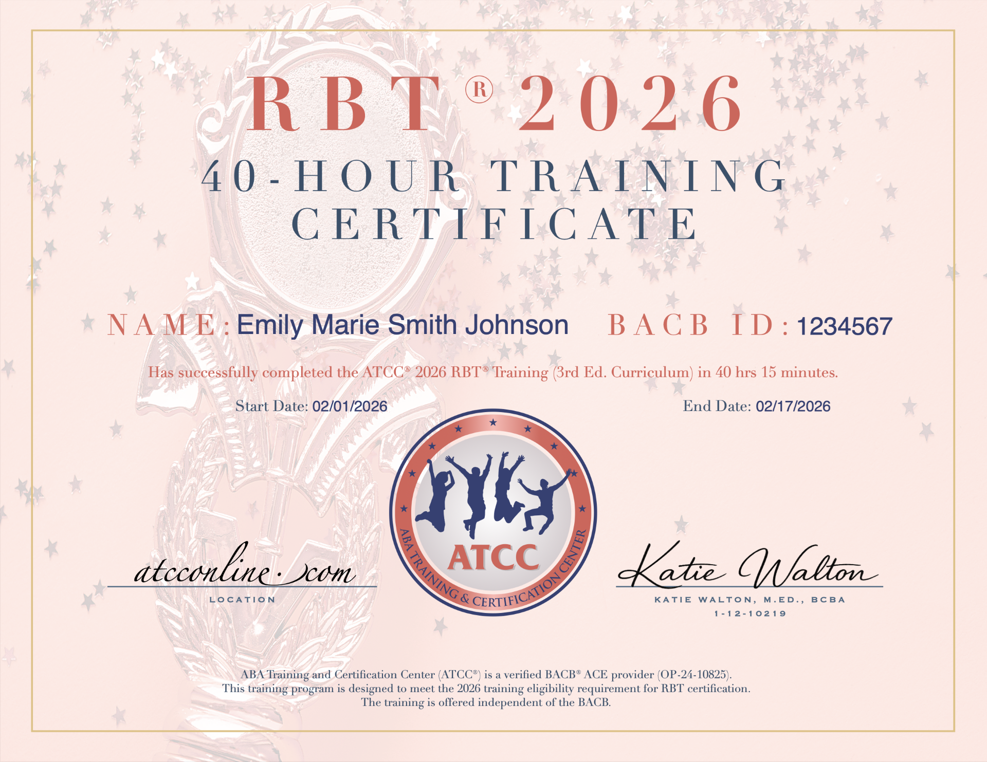 Looking for the best RBT® training and certification programs? ATCC® offers comprehensive, expert-led training aligned with the 2026 RBT® 40-Hour Training Requirements and the RBT® Test Content Outline (3rd ed.). Our programs prepare aspiring Registered Behavior Technicians® for BACB® certification with high-quality instruction, RBT® Competency Assessments, and remote BCBA® supervision. We also provide ABA parent training to support families of children with autism. Whether you're starting your career or advancing your skills, ATCC® delivers the trusted training you need to succeed in the field of Applied Behavior Analysis. Contact us today to get started!