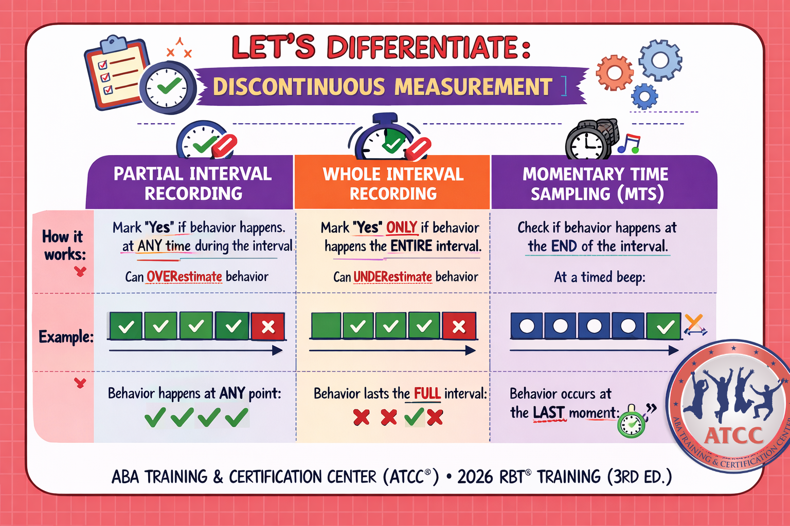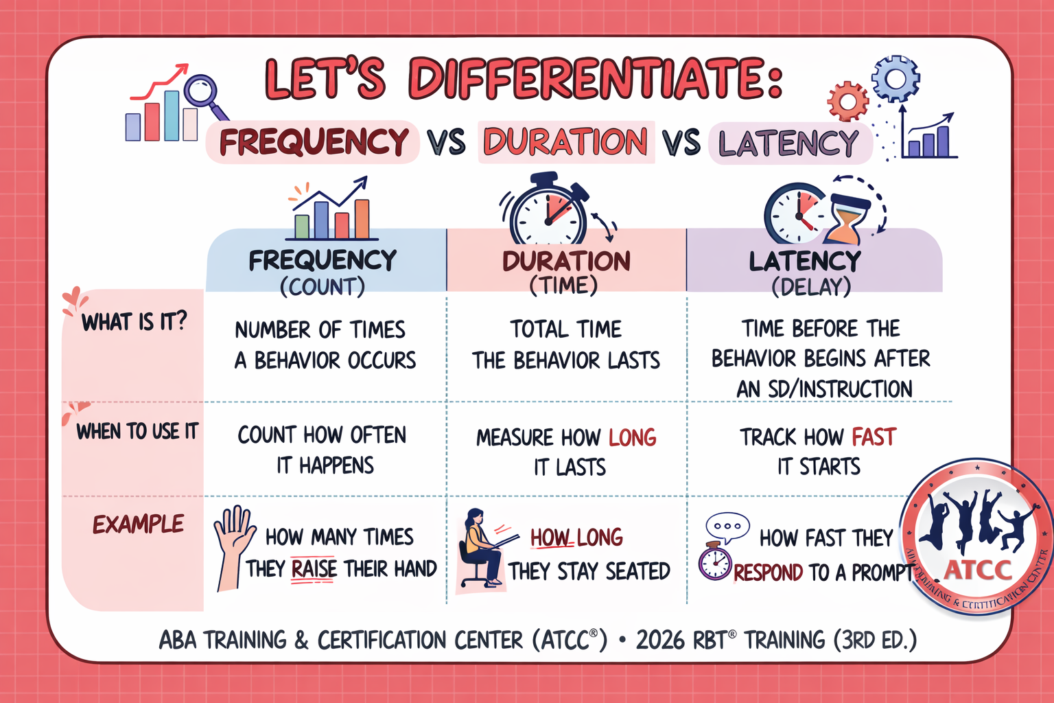 At ABA Training and Certification Center (ATCC®), we believe strong RBT®s are built on strong measurement skills. Anyone can memorize terms—but confident technicians understand why they are choosing frequency over duration, or interval sampling over continuous measurement. That level of clarity is what separates entry-level knowledge from true clinical readiness.