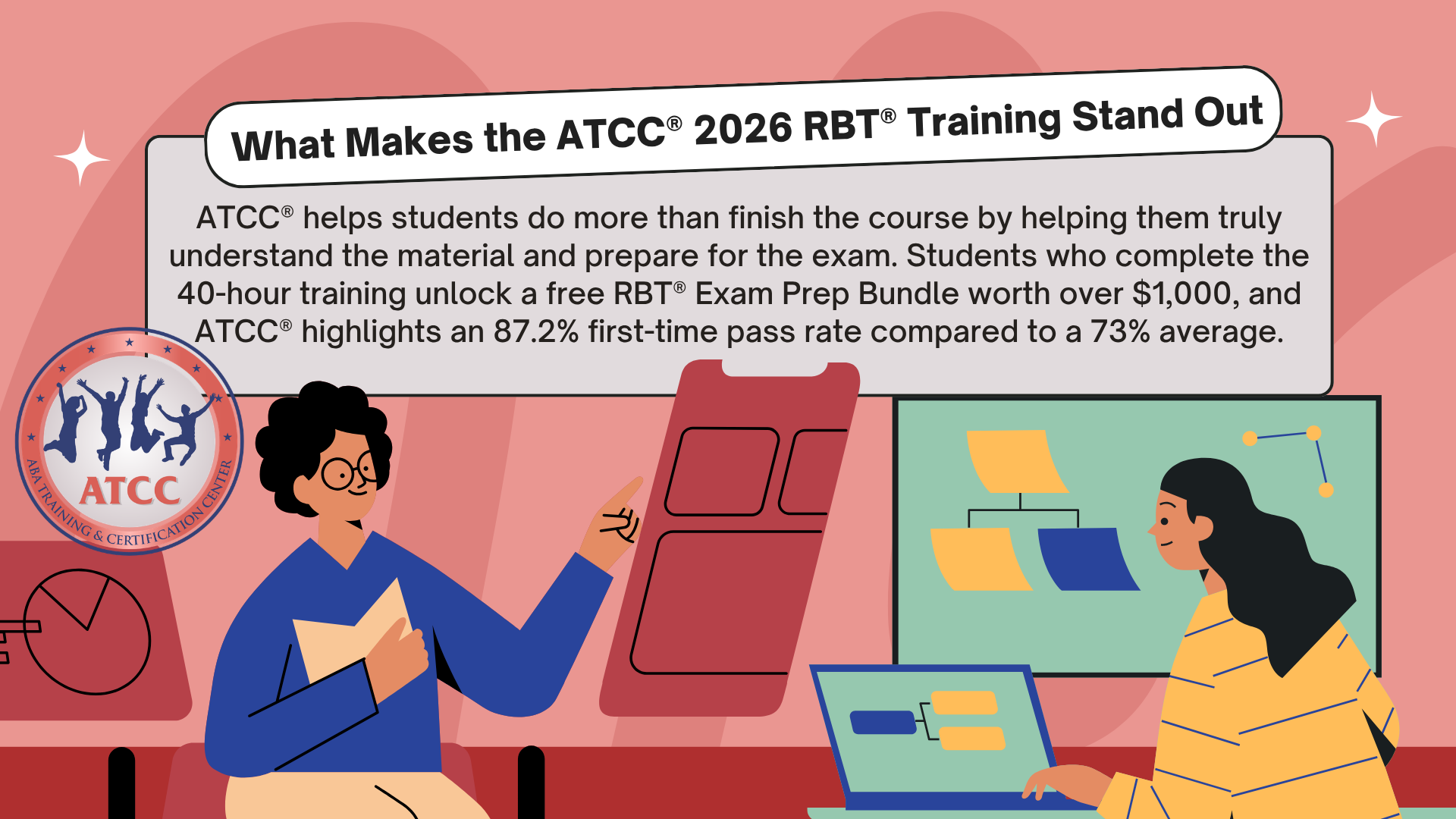 The ATCC® 2026 40-hour RBT® training is built around updated content, structured learning, and exam-focused support. According to the course page, students who complete the 40-hour training unlock a free RBT® Exam Prep Bundle described as a $1,000+ value. With an 87.2% first-time exam pass rate compared to the 73% average, ATCC® helps students prepare with confidence.