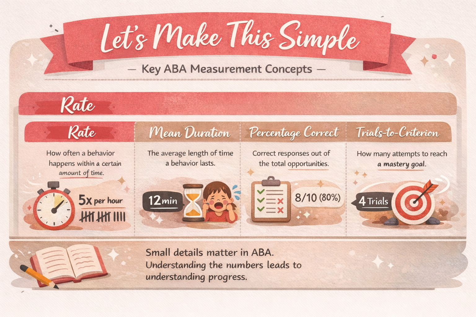 This is why learning how to calculate and summarize data matters so much. When an RBT® knows how to calculate a behavior’s rate, average duration, or percentage of correct responses, the data becomes more useful. It tells a clearer story. It can show whether a client is improving, whether an intervention is working, or whether something needs to change. The Chapter 15 preview specifically highlights rate, mean duration, percentage correct, and trials-to-criterion as core ways RBT®s learn to summarize ABA data.