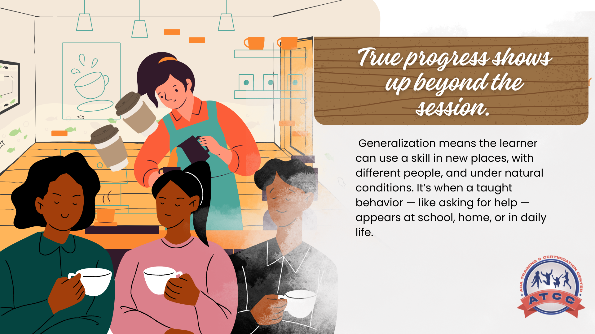 True progress shows up beyond the session. Generalization means the learner can use a skill in new places, with different people, and under natural conditions. It’s when a taught behavior — like asking for help — appears at school, home, or in daily life. That’s when learning becomes living.