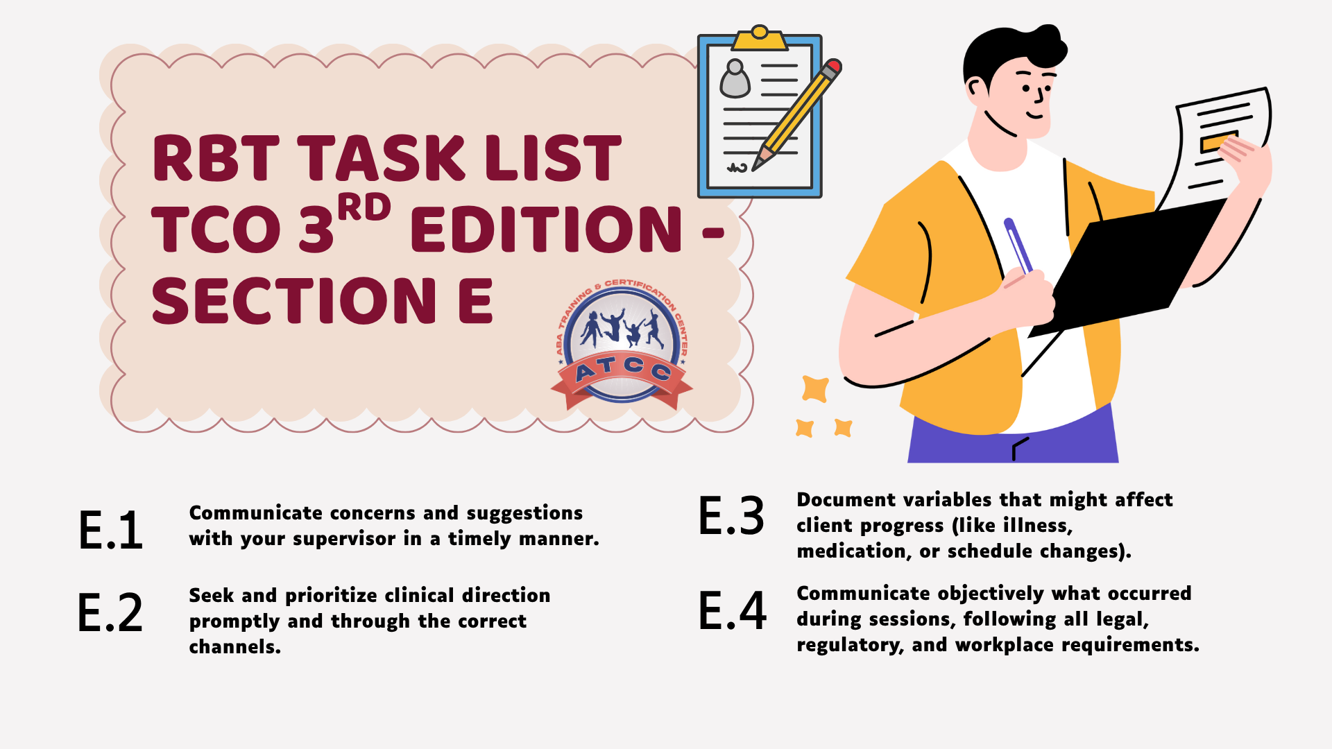 - E-3: Document variables that might affect client progress (like illness, medication, or schedule changes).